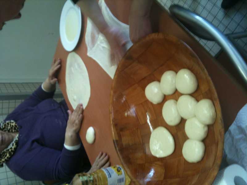 étaler finement une boule de pâte sur un plan huilé, l'aplatir avec les doigts imbibés du mélange (huile + beurre fondu), jusqu'a l'obtention d'une pâte très fine